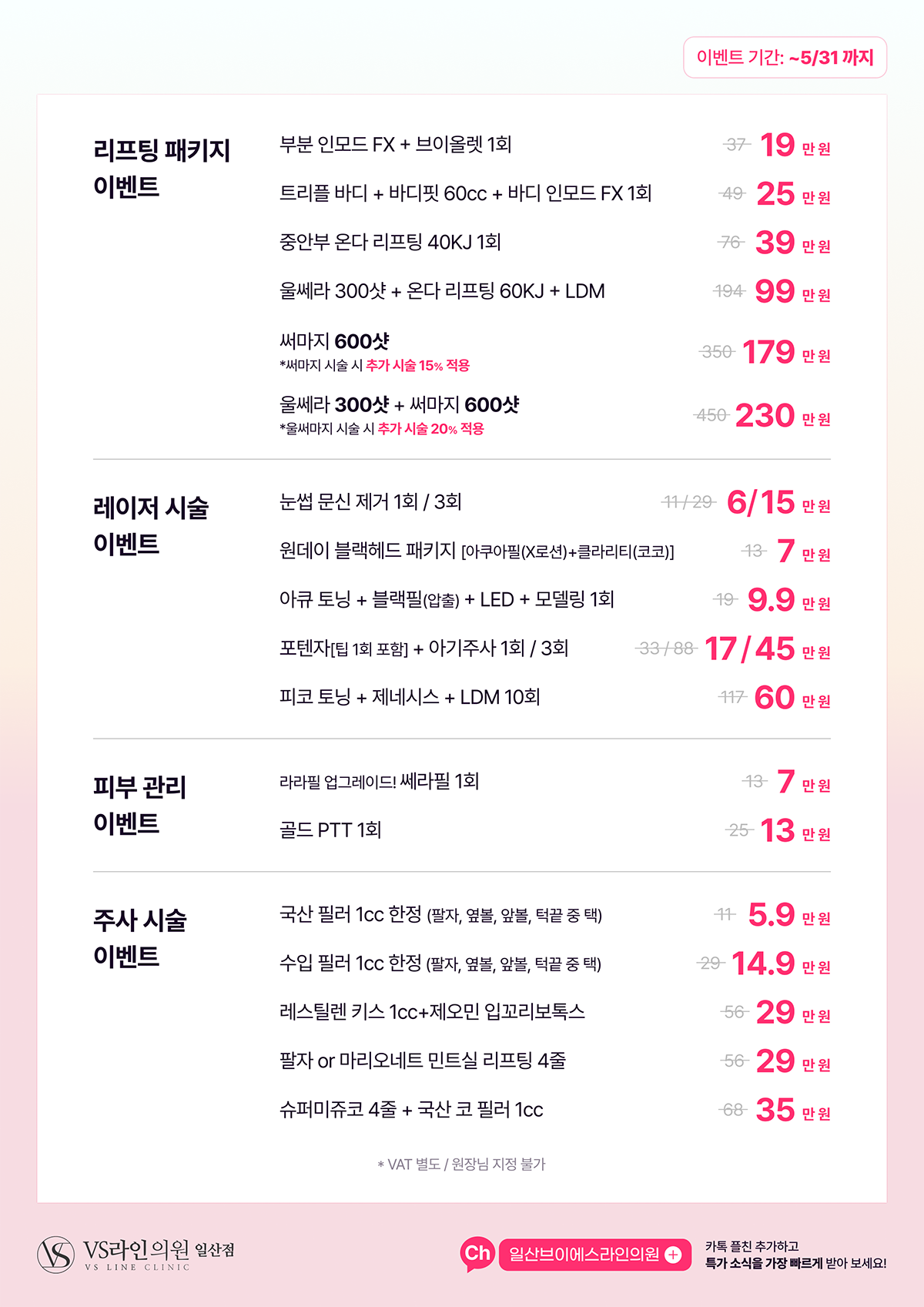VS라인 일산점 최신 이벤트는 이곳에 상시 업데이트 됩니다. 시술별 최신이벤트를 확인 하실 수 있습니다. 상담 및 문의는 VS라인 일산점(031-902-7031)으로 연락주시면 언제나 더욱 상세하고 친절한 상담 및 안내를 도와드립니다.